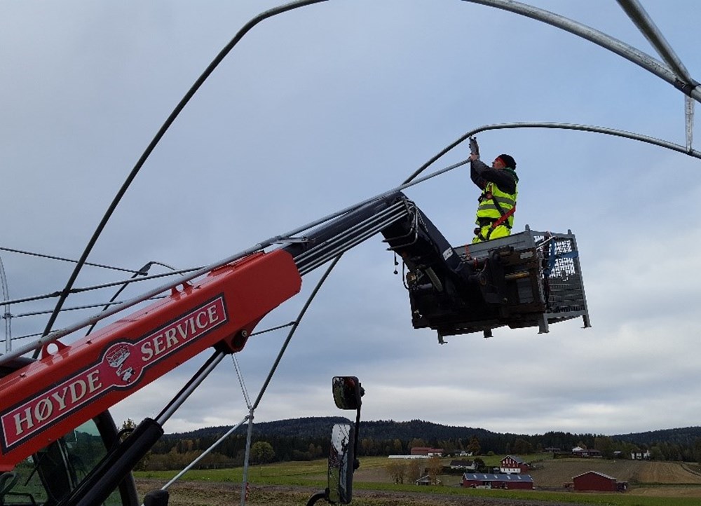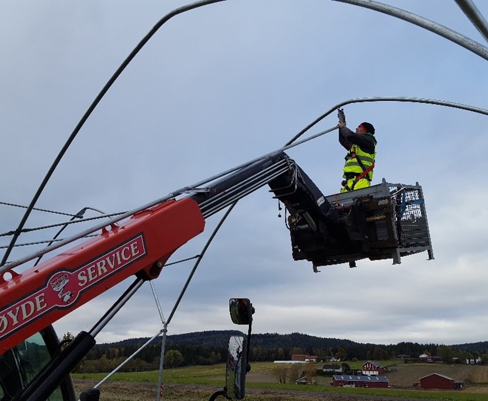 Myhrene AS har et erfarent byggeteam som raskt og effektivt bøyer bøyler og monterer tunneler og table top hos kunder over hele landet. Teamet tar også av og på plast på tunnelene.